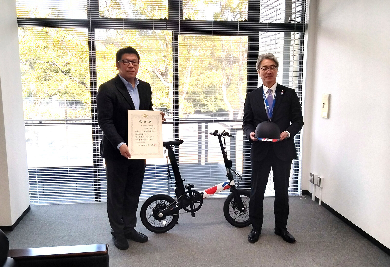 2026年1月14日、大阪府日本万国博覧会記念公園事務所に、大阪・関西万博仕様の電動アシスト自転車「VICCI / V-01」1台と、同仕様のヘルメット(SAFETY LABS / E-PATH) 1個を寄贈いたしました。